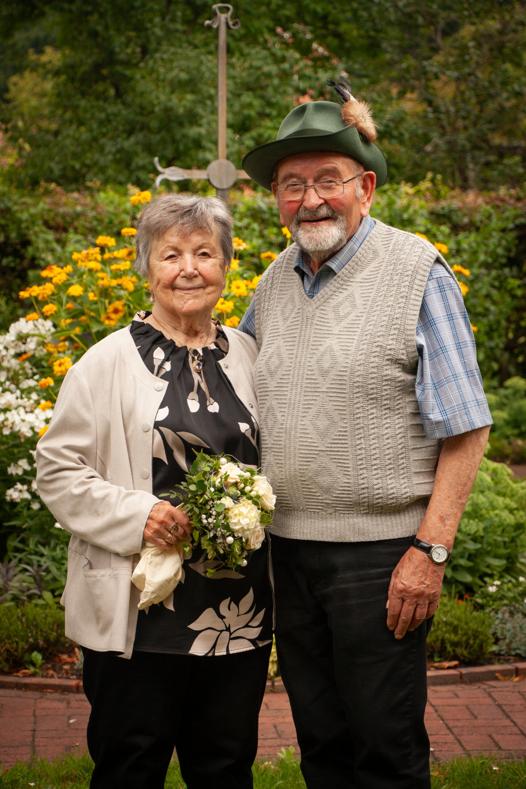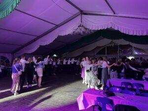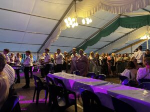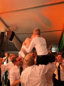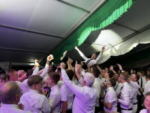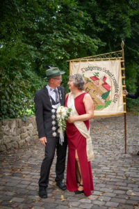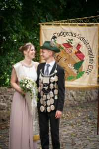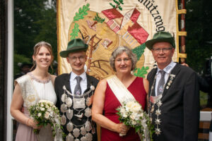 Am Sonntag um 15 Uhr hieß es: Bühne frei für die Majestäten. Unter den Klängen der Spielmannszüge Mesum Dorf und Elte stiegen die Könige mit ihrem Gefolge auf die Bühne. Tobias Rennemeier hatte seine Freundin Anna Steggemann als Königin dabei, begleitet vom Ehrengeleit Lukas Rennemeier und Tessa Schäche sowie Damian Böcker und Leonie Bolte. Neben dem Kinderpaar Mathis und Luisa kam noch ein besonderer Gast: Werner Hesping war vor 60 Jahren Schützenkönig und wurde mit lautem Jubel begrüßt. Die Damen mussten etwas länger auf ihren Kuchen warten, denn das Königspaar hatte sich gewünscht, am geschmückten Haus der Eltern vorbeizuziehen. Zum Glück, wie es sich hinterher herausstellte, denn die abendliche Polonäse fiel wegen des starken Regens aus. Das tat der guten Stimmung aber keinen Abbruch und die Schützengemeinde feierte ausgelassen den Königsball.